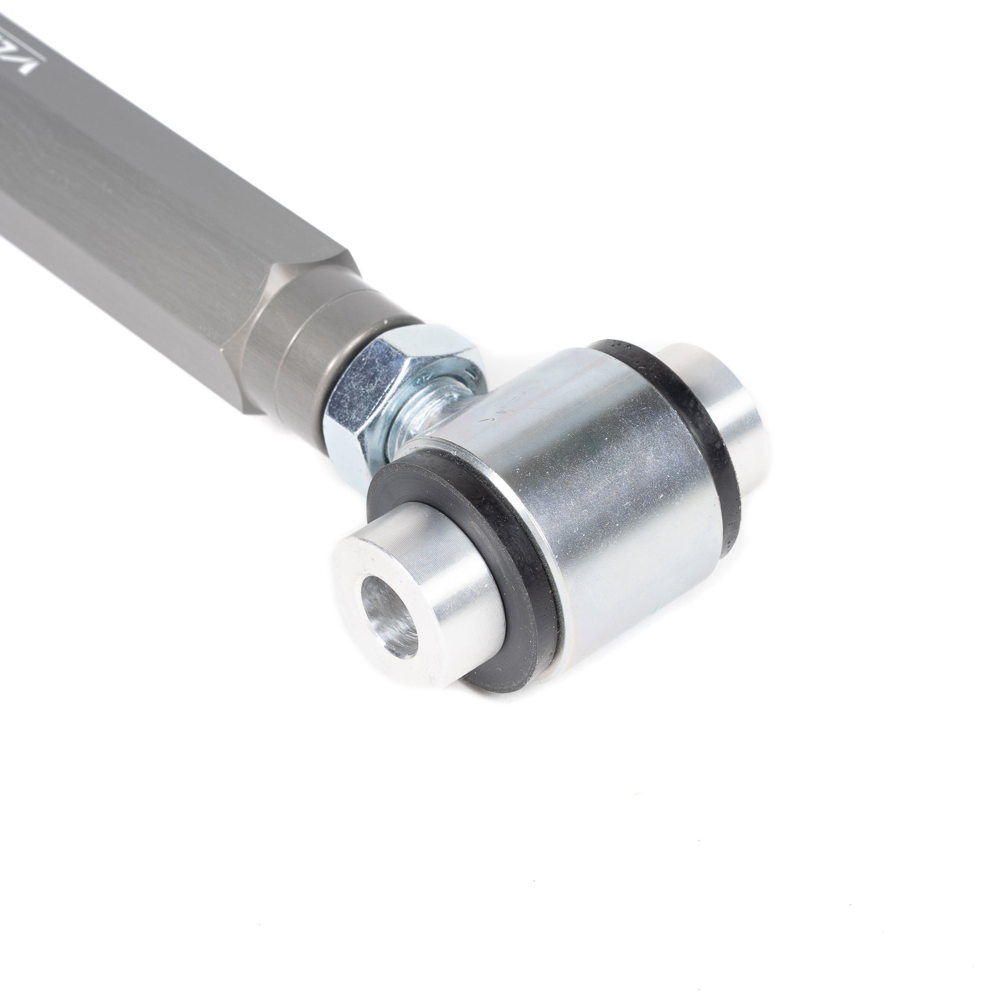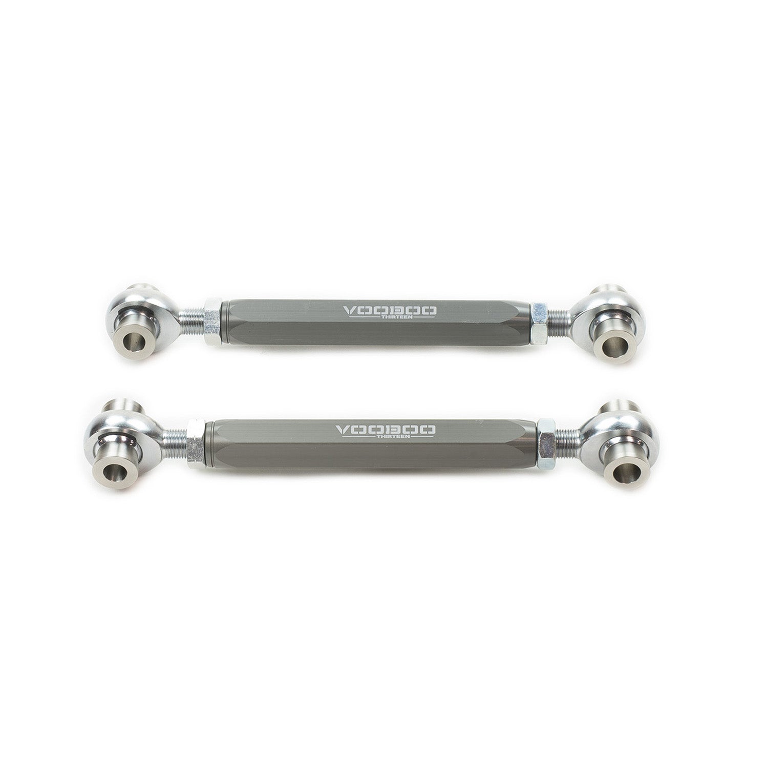 Voodoo13 adjustable rear Toe Arms give you the adjustability needed to get your toe back to spec after you've lowered your car. Voodoo13's suspension arms are engineered and designed for high performance street and race vehicles. They have been tested on race tracks across the globe, using feedback from top tier drivers and technical directors. Voodoo13 Toe Arms replace soft rubber OEM bushings with rigid spherical bearings, for increased handling and performance. However, they may sacrifice noise and comfort compared to arms that use rubber bushings. Our adjusting rod is made from 6061-T6 aluminum, which ensures our arms are incredibly strong and lightweight. MIL-A-8625 Type III Hard Anodize finish is available in multiple colors. CNC stainless steel spacers are machined in-house and work in conjunction with high quality made in the USA QA1 spherical rod ends.